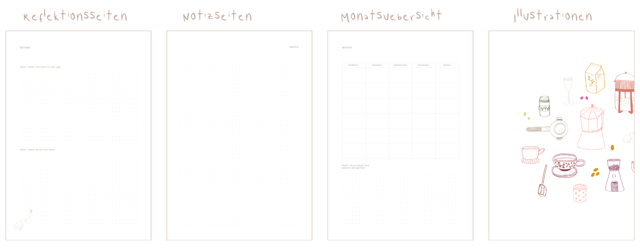 den Undated Planner (Cappuccino Edit) für deine Ideen, das Coffee Sticker Set für kleine Highlights im Alltag und die Postkarte „Coffee soon?“ als liebevollen Reminder zwischendurch.